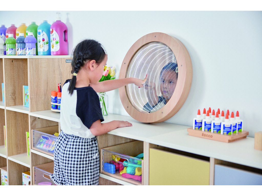 Keď je svetlo vypnuté, zrkadlo pôsobí ako obyčajné reflexné sklo. No po zapnutí svetla sa za zrkadlom objaví fascinujúci vír nekonečných svetiel, ktoré nemožno ani spočítať! Tento optický efekt vytvára dojem nekonečnej hĺbky a pohybu, ktorý upúta každé dieťa aj dospelého.